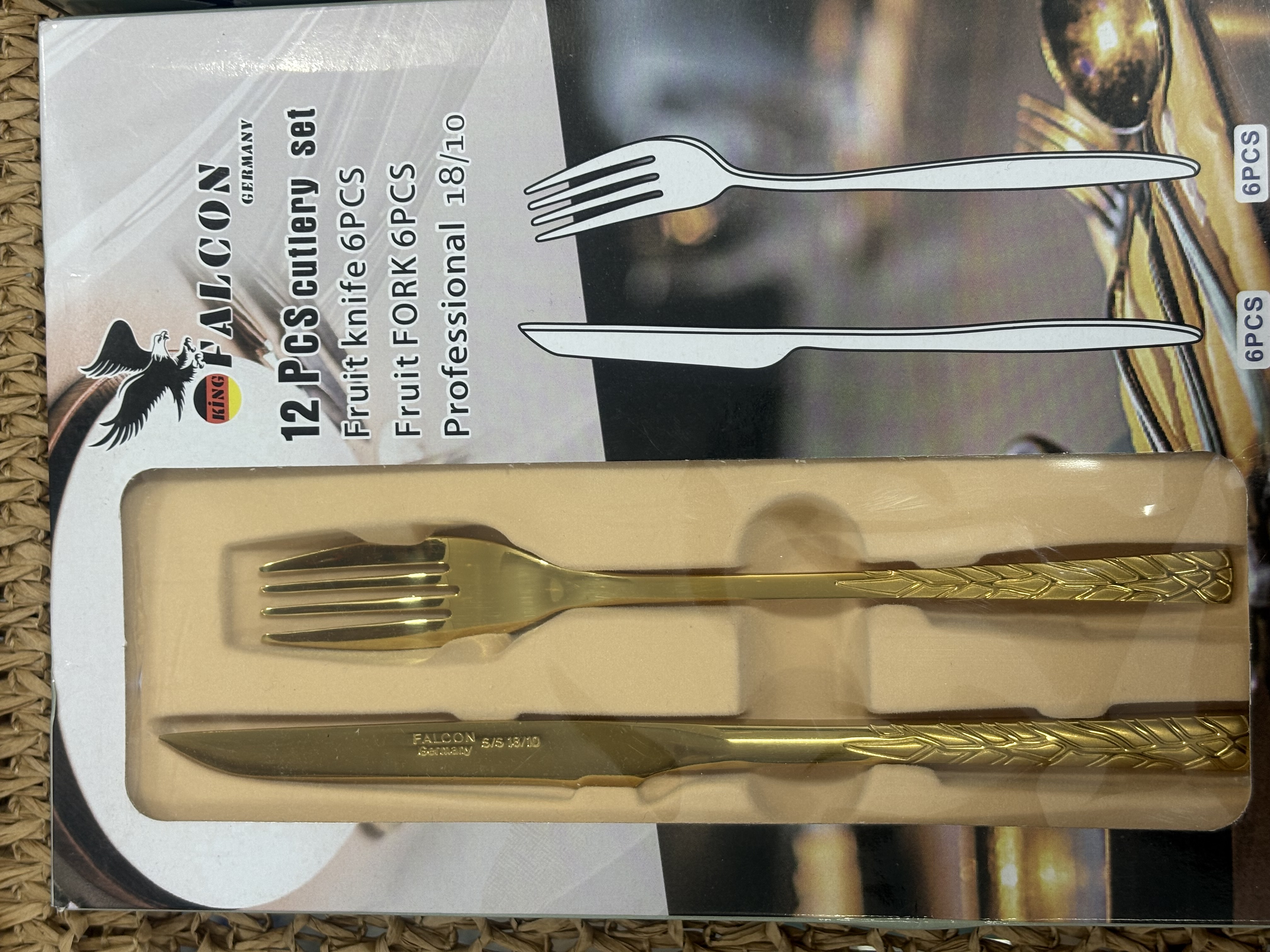 کارد و چنگال مارک فالکون وارداتی ساخت چین تحت لیسانس آلمان مدل طلایی طرح دار جنس استیل ۱۸۱۰ درجه یک