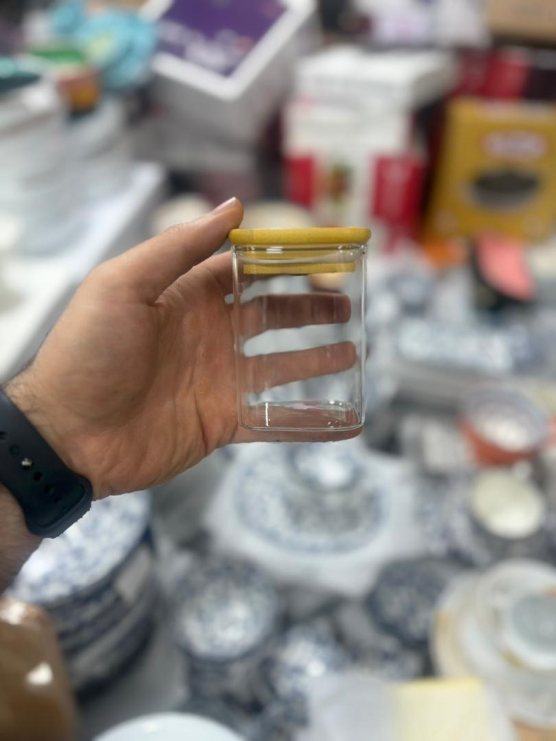 بانکه ادویه پیرکس مربع وارداتی ساخت چین دهنه ۶ سانت و ارتفاع ۸ سانت درب بامبو واشردار