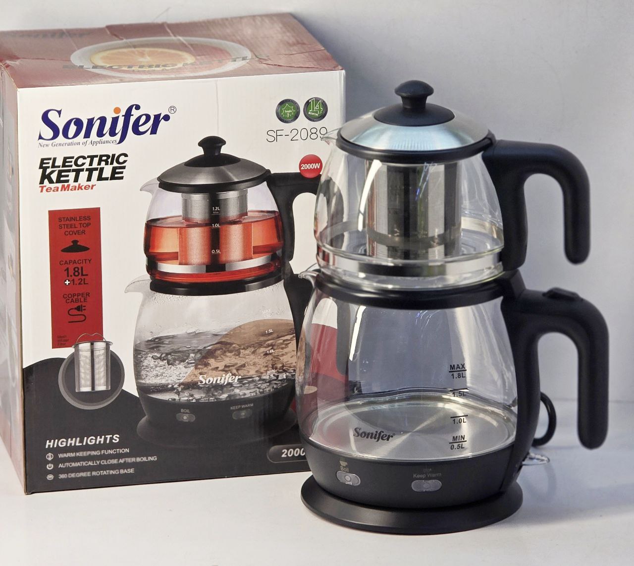 چایساز کتری و قوری برقی مارک SONIFER وارداتی ساخت چین کد ۲۰۸۹ مدل روهمی جنس پیرکس توان ۲۰۰۰ وات ظرفیت ۳ لیتر