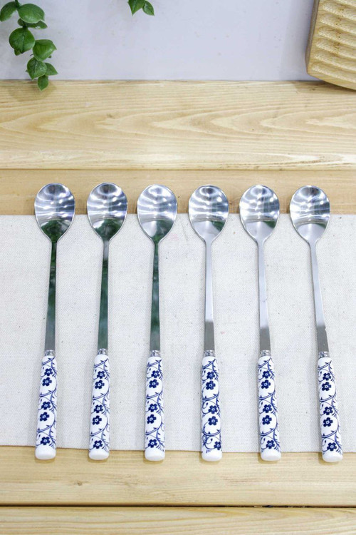 قاشق شربتخوری طرح گل آبی با طراحی ظریف و شیک، انتخابی ایدهآل برای سرو نوشیدنیهای خنک و دسر است.