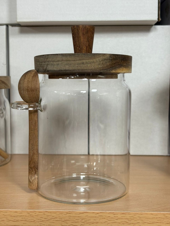 بانکه وارداتی ساخت چین با بدنه شفاف پیرکس مقاوم و درب چوبی آکاسیا به همراه قاشق همجنس، ترکیبی از سادگی و ظرافت است.