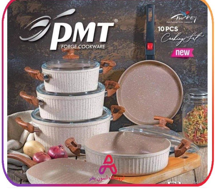 سرویس قابلمه ۱۰ پارچه مارک پی ام تی (اویز) تحت لیسانس ترکیه مدل السا جنس چدن داخل گرانیت شامل قابلمه سایز ۲۰ ،۲۴ ،۲۸ و تابه تکدسته سایز ۲۴ و تابه گریل مربع تکدسته سایز ۲۸ و تابه دو دسته سایز ۲۸