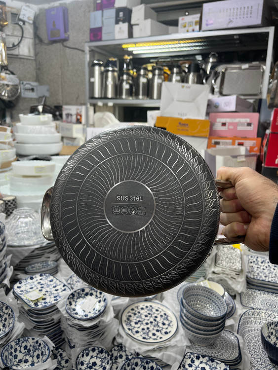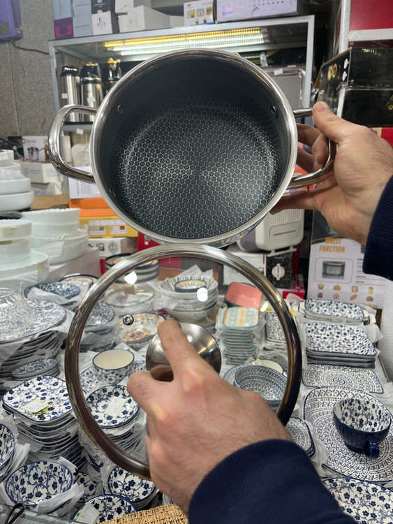 قابلمه وارداتی ساخت چین سایز ۲۶ با جنس استیل ۳۱۶ ضد زنگ و پوشش نچسب با کیفیت بسیار بالا، همراه با درب پیرکس مقاوم، مدل داخل زنبوری ضد خط و خش انتخابی عالی برای آشپزی سالم و راحت است. درب پیرکس آن امکان مشاهده فرآیند پخت بدون نیاز به برداشتن درب را فراهم میکند و پوشش نچسب از چسبیدن غذا جلوگیری میکند.
