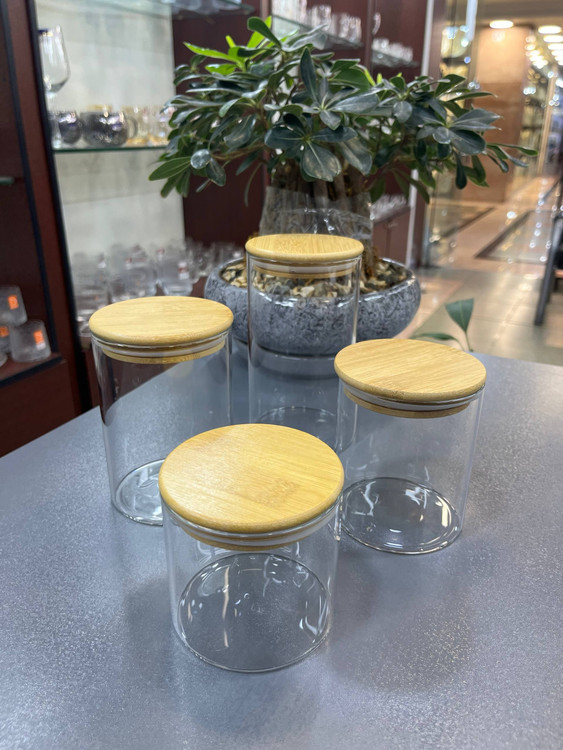 بانکه پیرکس وارداتی ساخت چین درب بامبو واشر دار مدل دایره ای قطر دهنه ۸/۵ سانت ست ۴ سایزی